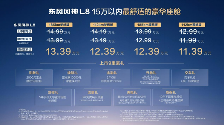 8月29日,第二十八届成都国际汽车展览会上,东风风神全新旗舰车型L8正式宣布上市。作为一款定位家用的智能混动SUV,新车以11.39万元的限时置换价(可叠加国/地补贴)进入市场,凭借其在舒适配置、智能科技及续航能力等方面的综合表现,为家庭用户提供了新的选择。