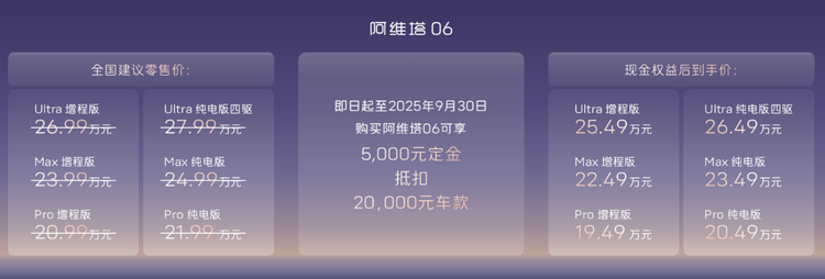 8月29日,阿维塔科技在第二十八届成都国际汽车展览会上宣布,阿维塔06 Ultra增程版正式上市,售价26.99万元。新车是首批搭载华为乾崑ADS 4与鸿蒙座舱HarmonySpace 5的车型,配备45.06kWh宁德时代5C骁遥超级增·混电池,支持5C充电峰值倍率,CLTC纯电续航里程达330km。