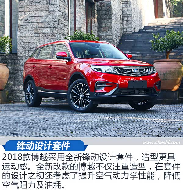 2018款博越采用全新锋动设计套件,造型更具运动感。全新改款的博越不仅注重造型,在套件的设计之初还考虑了提升空气动力学性能,降低空气阻力及油耗。
