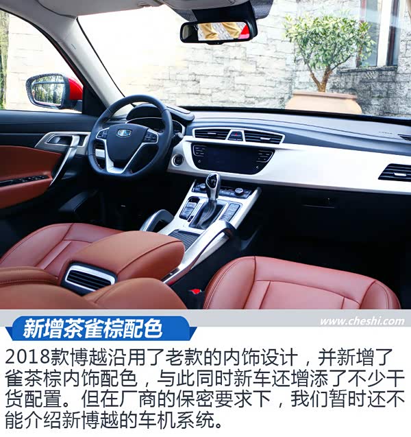 2018款博越沿用了老款的内饰设计,并新增了雀茶棕内饰配色,与此同时新车还增添了不少干货配置。但在厂商的保密要求下,我们暂时还不能介绍新博越的车机系统。