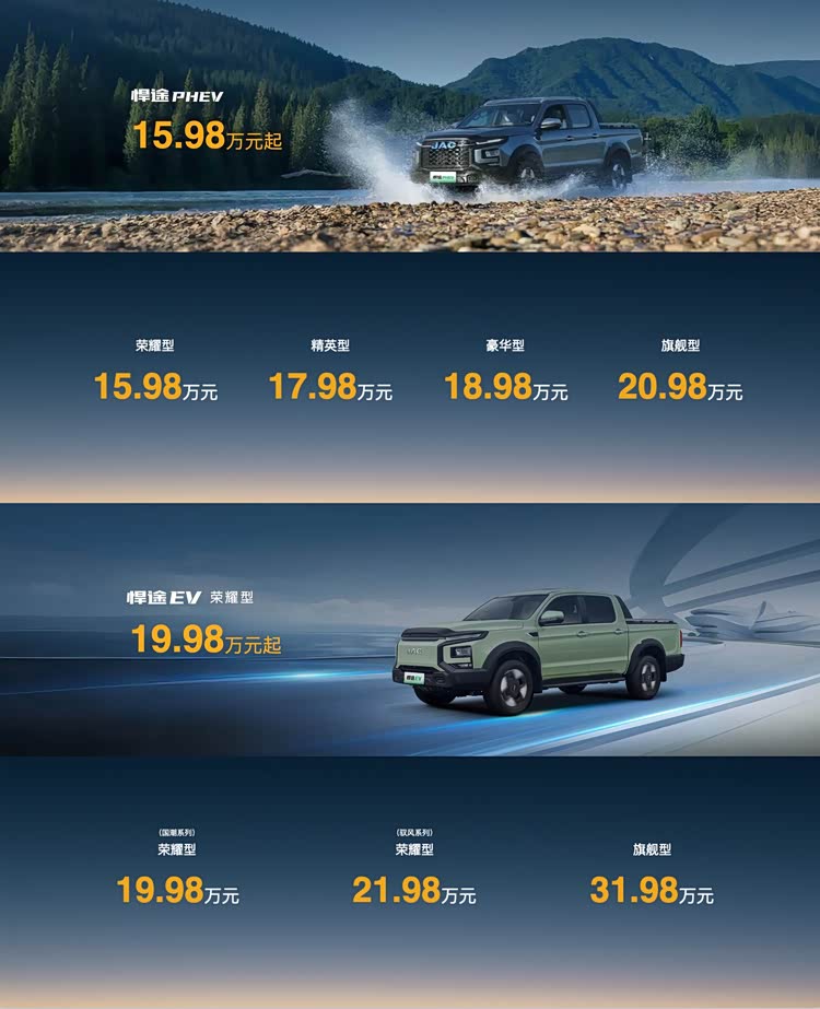 千钧之势,敢纵山河!全球首款千扭电混皮卡——悍途PHEV基于江汽集团自主研发的“H-Power”悍行超级电混架构打造,拥有“超级电混、五星安全、全域场景”等核心价值,市场指导价为15.98万元-20.98万元,上市期间购车可享订车礼,限时下订1000元抵3000元;焕新礼,增换购补贴至高10000元;质保礼,电池电机5年/20万公里、电控8年/20万公里;畅联礼,基础流量终身免费,娱乐流量3年免费(每月3GB)。同步上市的国内首款非承载式纯电四驱皮卡——悍途EV,市场指导价为19.98万元-31.98万元,上市期间购车可享订车礼,限时下订1000元抵3000元;质保礼,电池8年/40万公里、电机电控5年/20万公里;畅联礼,基础+娱乐流量终身免费(每月3GB)。