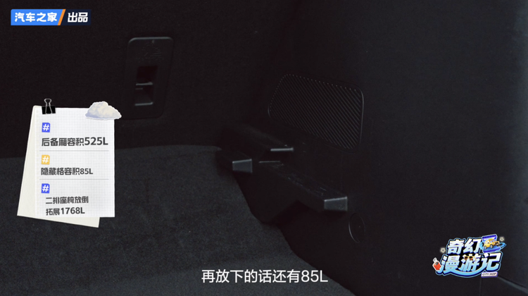 更贴心的是那两档可调节隔板,能额外拓展 85L 隐藏空间,总容积到 610L,折叠伞、充电线和应急工具分类放在隔板上,后备厢始终整整齐齐,一点不杂乱。