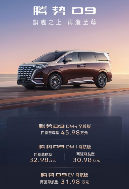8月29日,腾势D9新品正式上市,共推出至尊版、尊航版4款型,官方指导价30.98万元起。腾势D9新品标配超过200项科技豪华配置,并在旗舰之上再造至尊,满足用户更加多元化的科技豪华MPV需求。