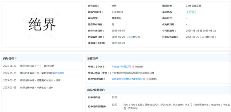 这次华为成功注册的 “ 绝界 ” 商标,国际分类为 12 类运输工具,覆盖汽车车轮、汽车座椅、电动汽车、汽车车身、混合动力汽车和自动驾驶汽车等。