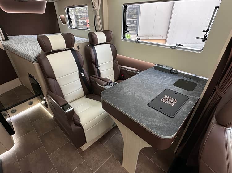 驾驶舱延续福特原厂设计,布局简洁实用。生活区则以新星房车一贯的简约庄重风格呈现,氛围灯点缀与精细家具工艺营造出温馨氛围。后排两张独立航空座椅支持电动调节、通风、加热及按摩功能,搭配前方大尺寸餐桌(集成电磁炉与茶海),兼顾商务与休闲需求。