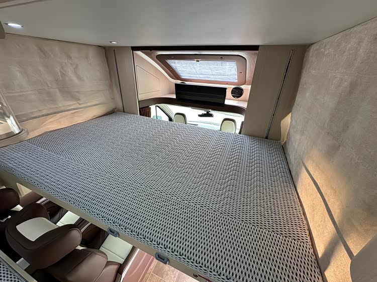 睡卧区提供双床布局:尾部纵置双人床(1900×1300毫米)与客厅上方电动升降吊床(2100×1300毫米),均采用高密度海绵4D打孔透气床垫,保障睡眠舒适性。