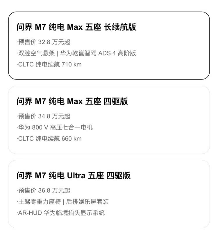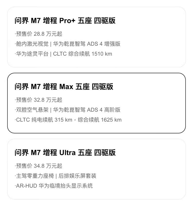 动力配置上,增程版搭载1.5T增程器,最大功率118kW,提供两驱和四驱可选,两驱版电机最大功率227kW;四驱版电机综合功率392kW,提供容量为37kWh和53kWh电池组可选,CLTC综合续航1600km。纯电版通用提供两驱版和四驱版可选,两驱版电机最大功率227kW;四驱版综合功率387kW,最高车速可达200km/h,标配100kWh电池组,CLTC纯电续航610km-700km。新车搭载华为途灵底盘,悬架升级为前双叉臂式后五连杆式独立悬架的形式,并有望配备空气悬架和可变阻尼减振器。
