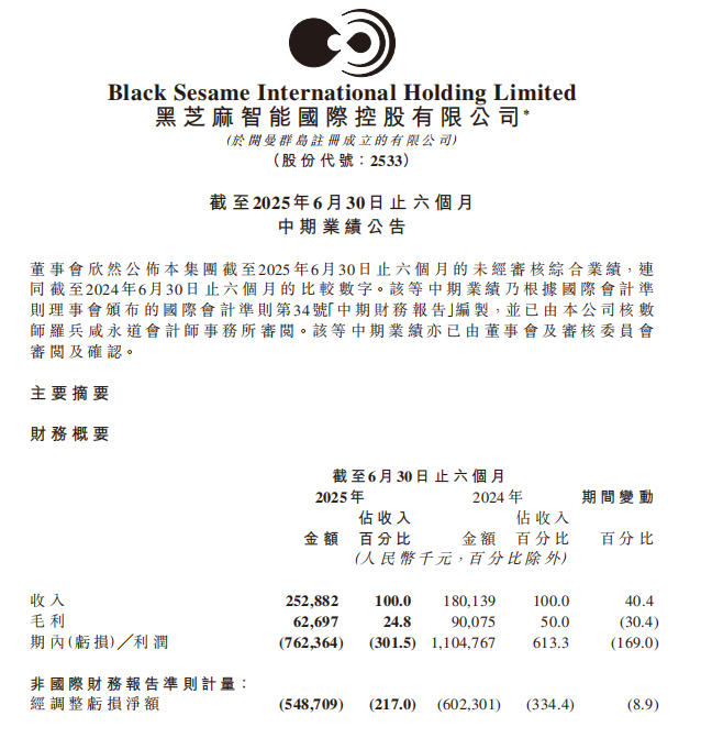 黑芝麻智能2025年上半年利润,图源黑芝麻智能2025年半年报