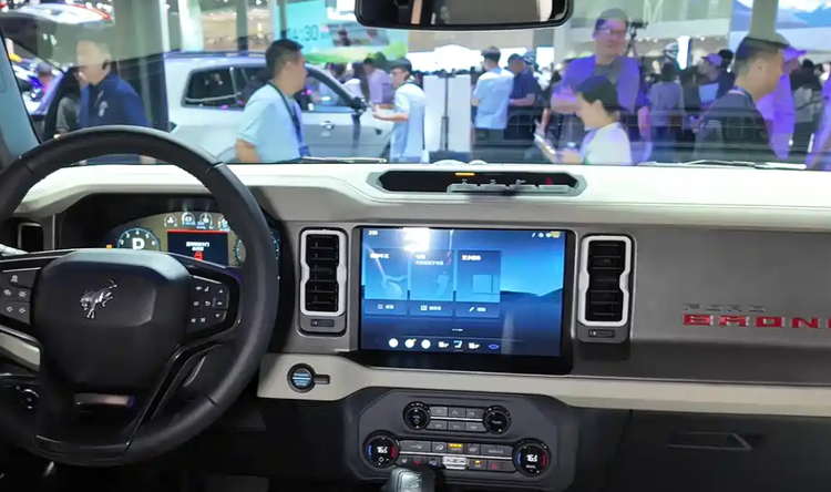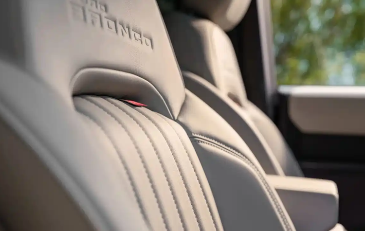 走进车内,烈马 1966 的内饰质感比现款烈马有明显提升,核心亮点是绗缝工艺皮质座椅—— 座椅表面的菱形缝线细腻工整,边缘还隐约可见复古纹路,触感柔软且支撑性十足,长途越野时能缓解腰部疲劳;座椅背面取消了传统的置物板,简化了视觉效果,也避免了越野颠簸时置物板异响的问题。副驾驶前方的饰板上,用红色字体印着 “BRONCO” 字样,与前脸徽标呼应,进一步强化车型身份标识。