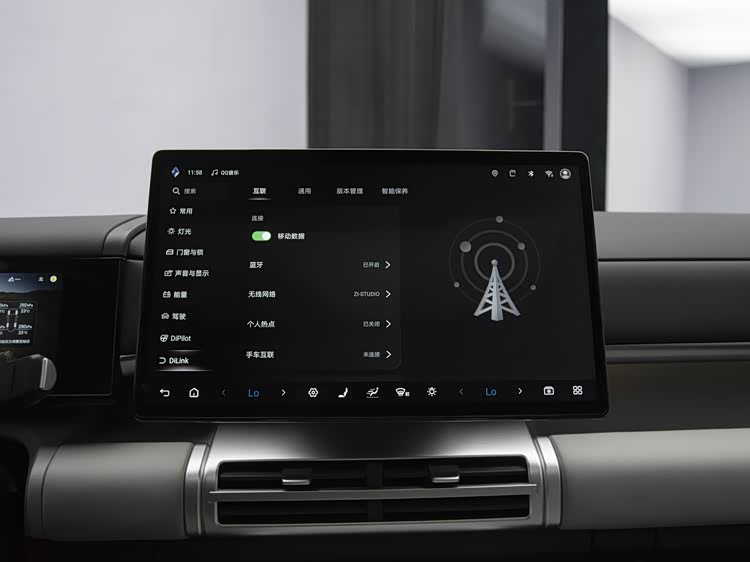 座椅采用2+3五座布局,全车电动调节、通风、加热统统标配,前排还带按摩功能。后排有独立空调控制屏,中央通道位置还配备了4.5升车载冷暖冰箱——夏天冰饮料、冬天热咖啡,实用度满分。更夸张的是,后排还可选装双12.95英寸拔插屏,配合20扬声器“迪声”音响系统,整车娱乐体验直接拉满。