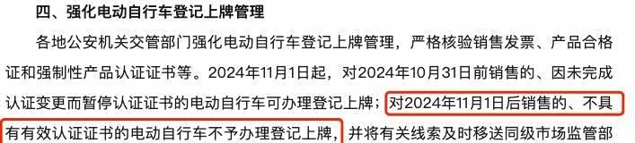 而车辆必须具备有效认证证书,则是电动车上牌必不可少的一大条件。因为各地都已明确,在10月31日前销售的,因没有完成认证变更而暂停认证证书的电动自行车,仍可以办理登记上牌;而11月1日之后销售的,不具备有效认证证书的电动自行车,全部不予登记上牌。