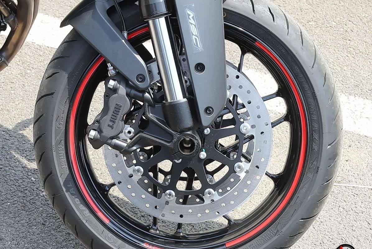 制动方面,前轮是320mm双碟,搭配辐射式四活塞卡钳,从600km/h制动大概只需要2秒,制动效果相当出色。后轮是260mm单碟加双活塞卡钳,前后配合,让刹车更有信心。轮胎用的是玛吉斯ST2高性能胎,前120/70R17,后180/55R17,抓地力强,能适应各种路况,保障骑行安全。