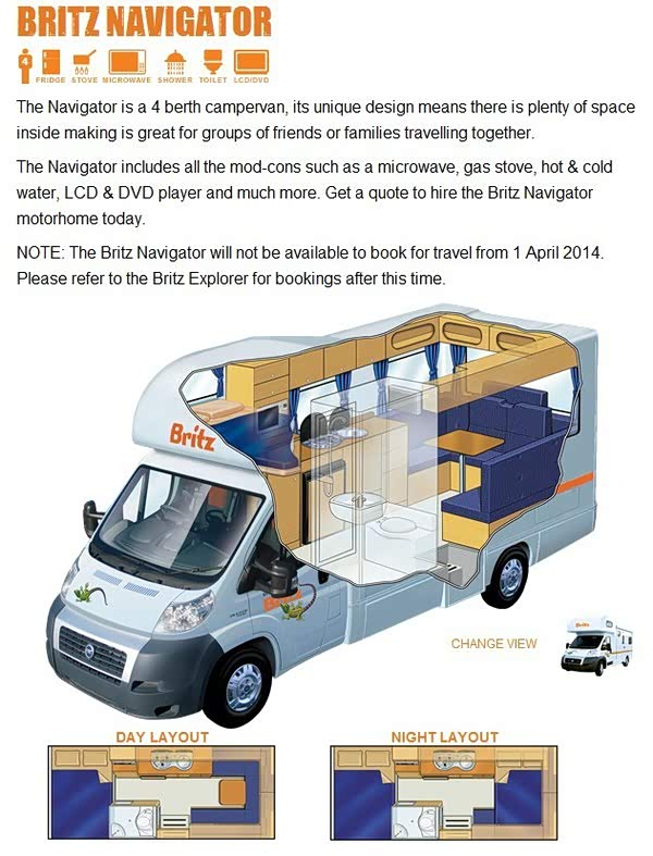 BRITZ车型分为2铺位房车冒险家(Venturer), 4铺位房车探险家型(Explorer)和6铺位房车前沿型(Frontier)可以选择。每辆车型配置齐备厨房、淋浴、洗手间及日常生活设备。
