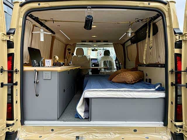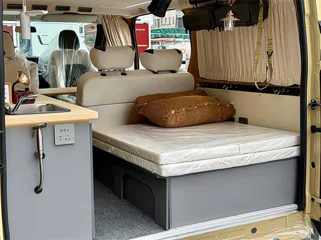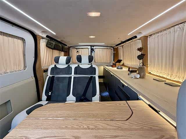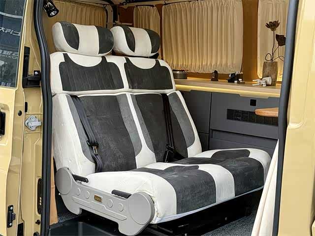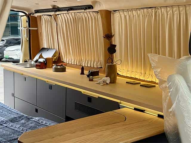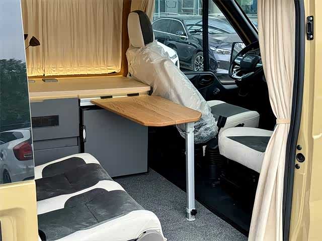 进入车内,舒适与温馨扑面而来。全车采用房车定制工艺,止震隔音保温处理,隔绝外界喧嚣与温差,即使在户外也能拥有静谧舒适的环境。霍尼尔绒车顶、内饰侧围及中门+后尾门的包覆,搭配房车专用EO级环保板材家具,不仅触感柔软,更确保健康安全。二排2座拼床座椅可展开为220cmX130cm的舒适睡床,搭配3cm厚床垫,满足两人安心休憩;可隐藏折叠桌、40升房车专用冰箱、水池与水路系统等,让烹饪、用餐等日常需求在车内轻松解决。