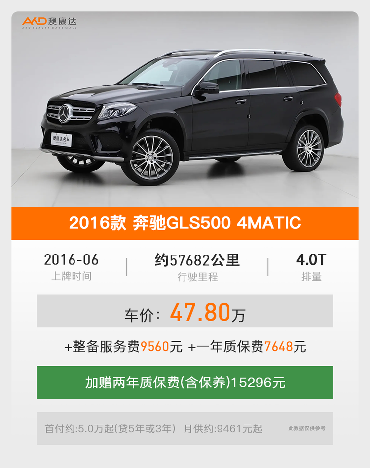 4.0T双涡轮增压发动机拥有422马力和600牛米,配备了空气悬架,以及带有低速扭矩放大及锁止功能的四驱系统,能够轻松应对轻度越野路况。目前澳康达在售这台2016款顶配的 奔驰GLS(参数|询价),行驶了约5.7万公里,售价仅需47.8万。