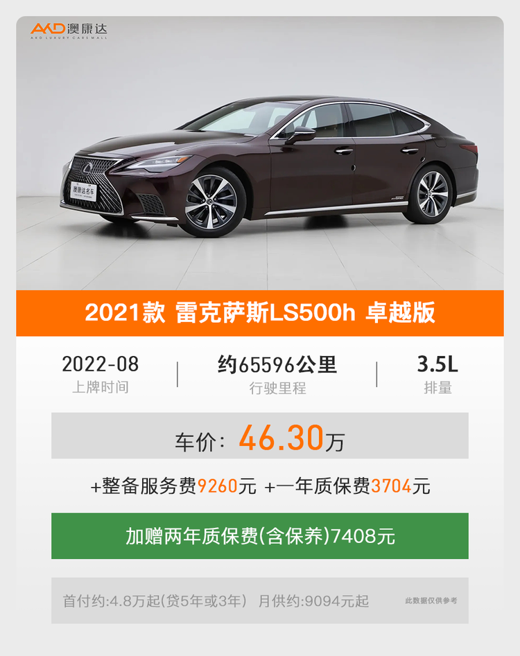 目前澳康达在售这台2021款雷克萨斯LS500h 卓越版,行驶了6.5万公里,售价仅需46.3万,带空气悬架、电吸门、后排遮阳帘和冷热通风座椅等豪华配置,整体表现不张扬却极具内涵,适合有品位且低调的老板拥有。