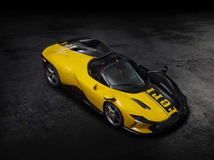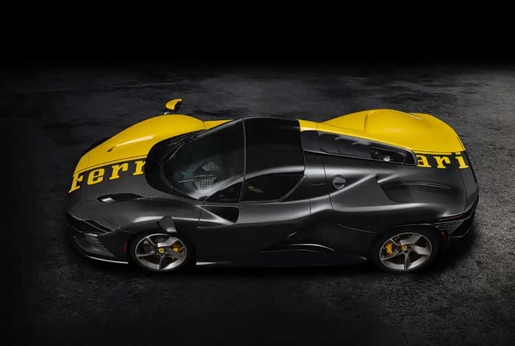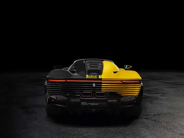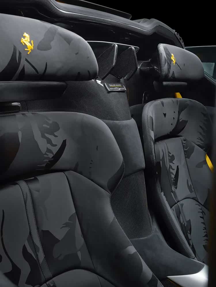 这台法拉利 Daytona SP3(参数|询价)个性化定制车型,堪称跃马个性化定制项目的巅峰之作。新车采用极具辨识度的双色车身涂装,碳纤维饰面搭配摩德纳黄色(Giallo Modena),与亮黑色前分流器、门槛及后扩散器形成鲜明的视觉对比。在这一独具特色的车身涂装之上,横贯车身上部的摩德纳黄色“Ferrari”标识成为了点睛之笔,这也是法拉利标识首次以此形式应用于车身涂装。