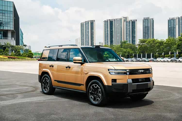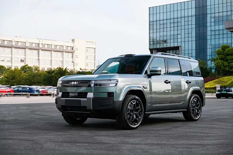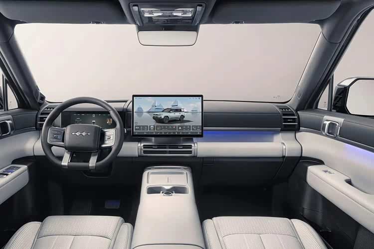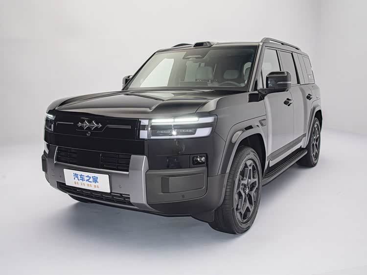 方程豹钛 7 延续了方程豹家族硬派 SUV 常见的 “方盒子” 车身轮廓,前脸部分采用封闭式中网,中间镶嵌着方程豹的车标 LOGO 。前灯组的双层式设计十分独特,点亮后呈现出双 L 形态。前包围区域设计较为厚重,中央的银灰色护板从底部一直延伸至中网,形成“H”字形结构,搭配两侧外扩的组件,彰显出硬派与厚实感。
