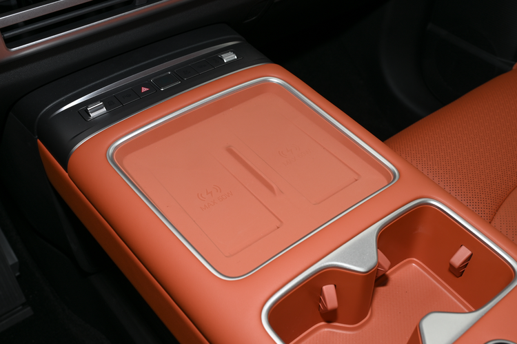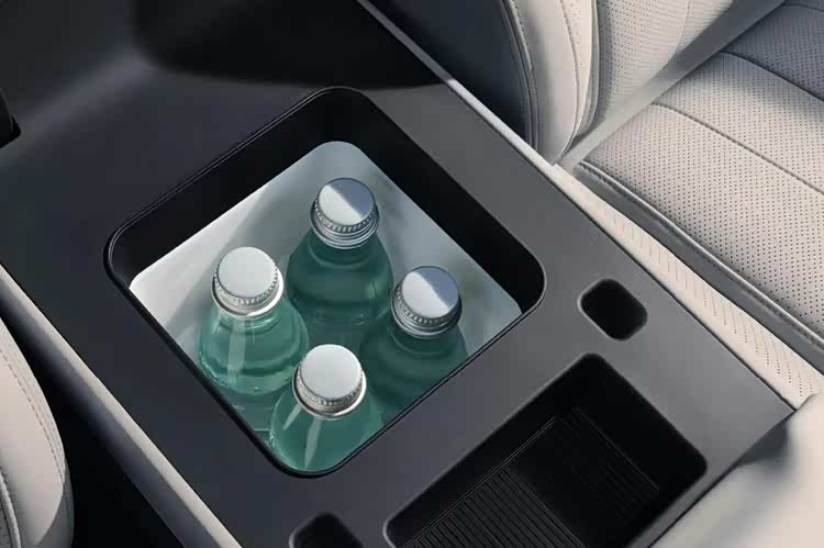 中央扶手箱内置车载冷暖冰箱,温度可在 - 6℃到 50℃之间调节。中控台下方还有额外的储物空间,并配备 12 伏电源接口、USB Type-C 手机接口等。