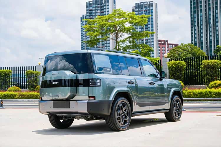 车尾部分,方程豹 钛7(参数|询价)采用了侧开式的后尾门和背挂式的“小书包”(小型外挂式储物箱),双 L 形尾灯组之间采用黑色饰板连接,并穿过小型外挂式储物箱,在其中间是方程豹车标,后保险杠还有一块矩形装饰板,中间是车牌框架,排气管采用隐藏式设计。