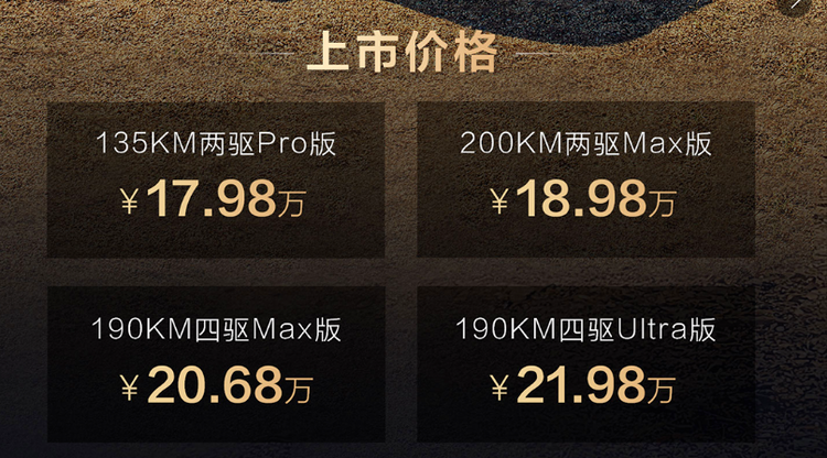 190KM 四驱 Max 版,售价 20.68 万元:该版本升级为四驱系统,采用前160kW+后200kW双电机,动力性能和通过性更强,适合那些偶尔有轻度越野需求,或者经常在路况不太好的地区行驶的消费者。虽然纯电续航里程相比 200KM 两驱 Max 版有所下降,但续航也有190KM,和200KM相差不大,加上四驱系统带来的驾驶乐趣和安全性提升,这个价格还是比较合理的。缺点是相比两驱版本,价格增加了17000元,同样部分高端配置如高阶音响、香氛系统等需要额外选装。