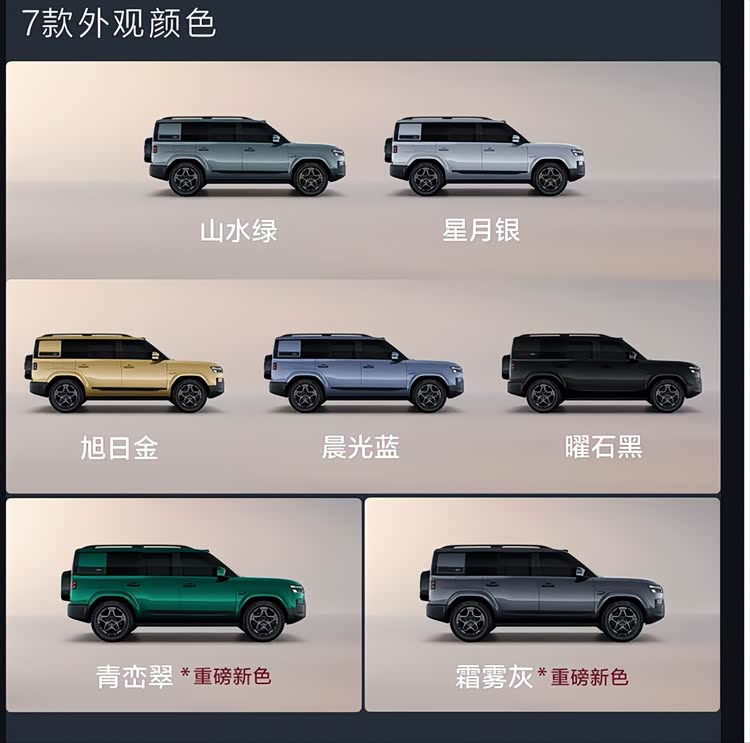 方程豹钛7提供了7种外观颜色供消费者选择,包括山水绿、曜石黑、旭日金、星月银、晨光蓝等。
