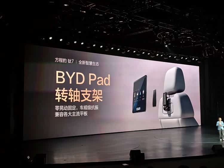首搭比亚迪自研的BYD Pad,可以进行车内45项功能控制。怕这个新的Pad用不习惯也没关系,因为前排座椅背后的转轴智驾能够兼容市面上的主流平板,同样可以实现固定和充电。