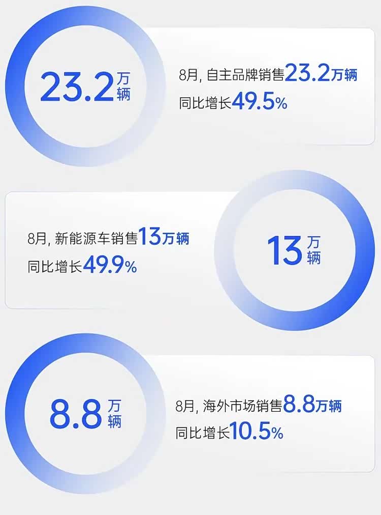 新能源方面,上汽新能源车销售13万辆,同比增49.9%;1-8月累计销售89.3万辆,同比增长44.4%。海外市场也保持稳健增长,1-8月累计销售66.4万辆。