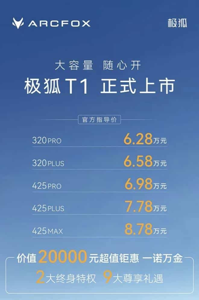 T1入门320 PRO 6.28万,425 MAX 8.78万,配置到顶。10.31前下订享“限时终身免费保养”,三电终身质保+烧一赔一,老带新还送积分。MG4 6.58万起,星愿6.88万起,元UP7.48万起,入门价都比T1高,且没有终身保养。算五年用车成本,T1又能省下一部iPhone。