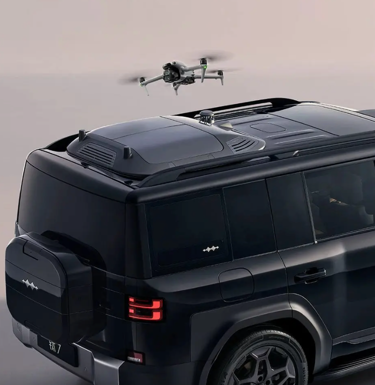 钛7首次搭载比亚迪“智能车+”生态战略,联合大疆、影石、支付宝等品牌打造多元化场景体验。可选装的灵鸢智能车载无人机系统支持25km/h时速动态起降,自动跟随车辆进行航拍。