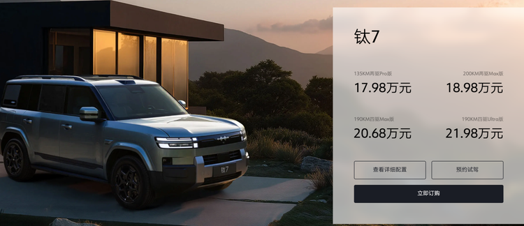2025年9月9日,比亚迪方程豹 钛7(参数|询价)正式上市,以17.98万-21.98万元的价格震撼了整个中大型SUV市场。这款被官方称为“大五座天花板”的新车,以其硬派外观与豪华配置的独特组合,成功吸引了家庭用户与越野爱好者的共同关注。