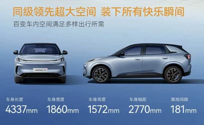 极狐T1虽然定位A0级,但车身尺寸却十分亮眼,4337mm的车长、1860mm的车宽和2770mm的轴距,使其拥有比同级车型更宽敞的内部空间。尤其是2770mm的轴距表现,甚至超越了一些更高级别的车型,为乘客提供了充足的腿部和头部空间。坐在后排,1.8米身高的乘客也能轻松翘起二郎腿,乘坐体验媲美部分B级车。
