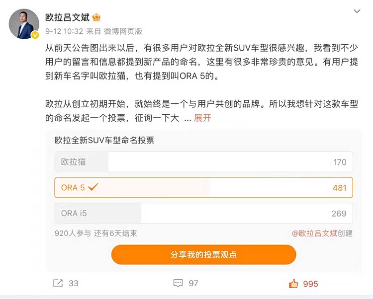 关于命名问题,这款车的最终名称也成为讨论焦点。在工信部公告中,“ORA 5”一词首次出现,引发了广泛关注。不少网友认为,“ORA 5”相比传统名称更加简洁易记,同时展现了国际化气质,非常符合欧拉品牌的战略方向。针对这一话题,欧拉品牌总经理吕文斌还特别发起了一次线上投票活动,截至9月15日,共近千人参与投票,其中,“欧拉5”以400多票领先其他候选名称。至于未来这款车是否会正式命名“欧拉5”,我们期待官方最终答案的揭晓。