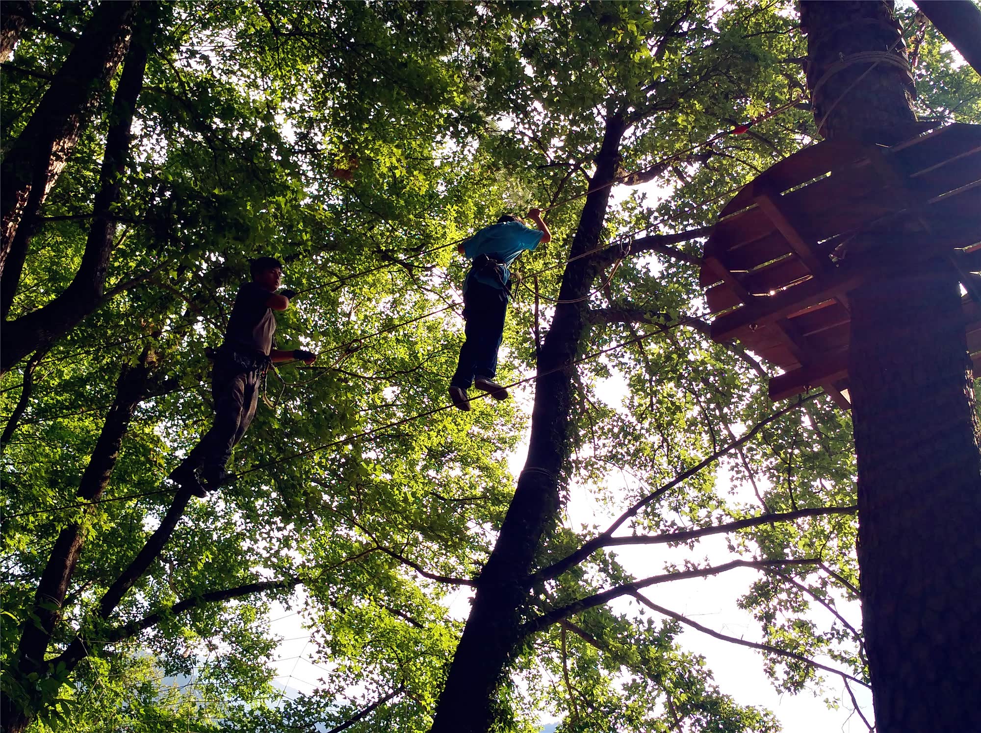 玩了大半天,也该回去了,在篁岭景区的入口处还有一个名为“冒险森林”的旅游项目,有兴趣的游客在篁岭旅游不但能看美景,还能体验一次冒险的历程。玩家在这里可通过爬、滑、游、跨、飞等动作挑战每条树上线路,到达终点,完成一次树上冒险历程,享受高空、速度、力量、毅力等户外探险必备的元素所带来的刺激,享受一场挑战自我的酷爽体验。游客在教练的帮助下可以根据自己的能力选择高空探险、低空探险、儿童还可以选择儿童体验线路。 我家小朋友其实在进入景区前就盘算着要去玩一下,回程路上又路过了这个项目,那当然不能错过咯。