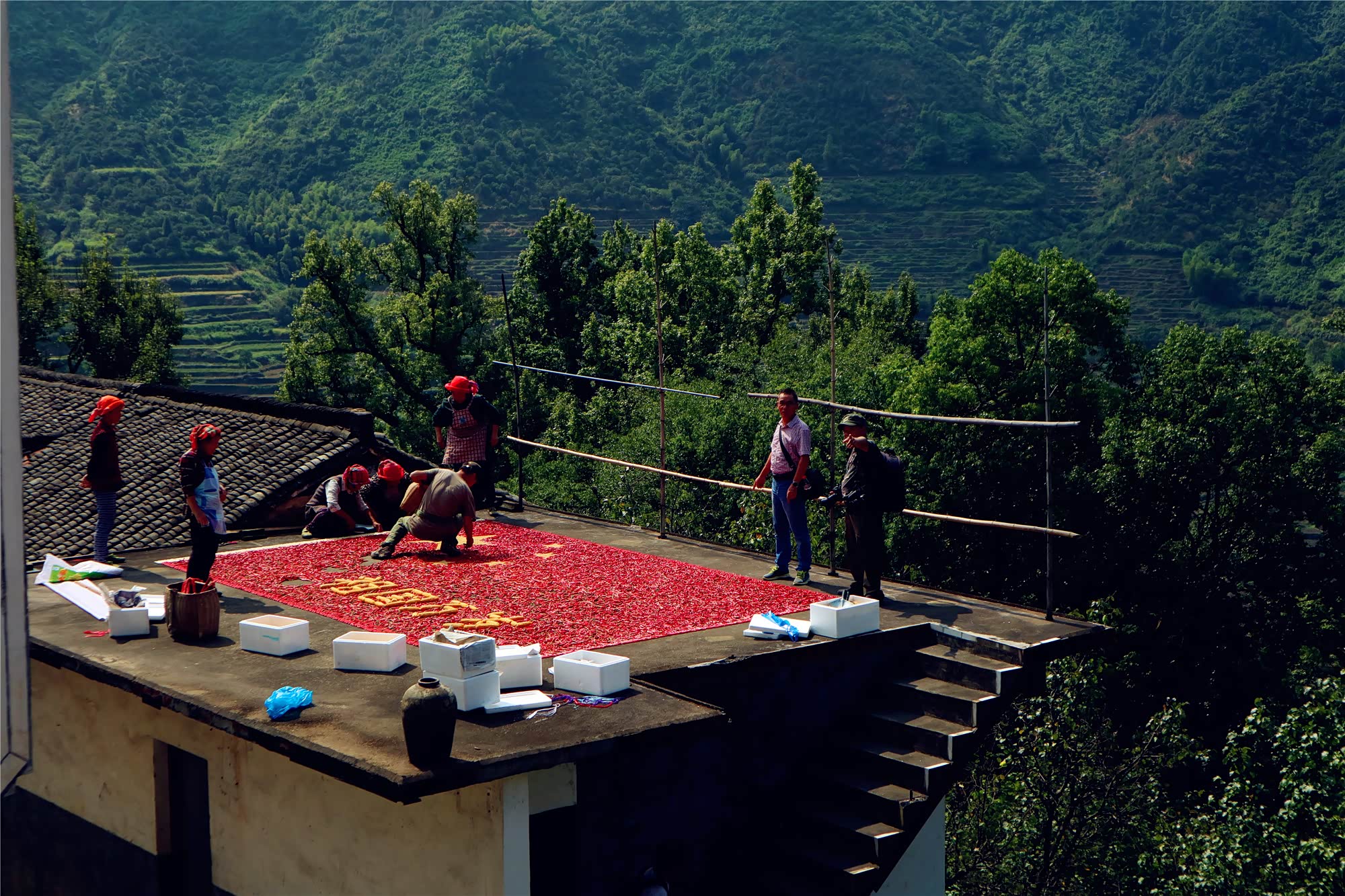 篁岭最佳的旅游季节是每年九月下旬到十月下旬,这正是当地人家晒秋的时节。所谓晒秋是指在湖南、安徽、江西等生活在山区的村民,由于地势复杂,村庄平地极少,只好利用房前屋后及自家窗台屋顶架晒、挂晒农作物,久而久之就演变成一种传统农俗现象。这种村民晾晒农作物的特殊生活方式和场景,逐步成了画家、摄影家追逐创造的素材,并塑造出诗意般的“晒秋”称呼。 我们去的时候适逢国庆佳节,当地人民用农作物拼出了国旗和“祖国万岁”的字样,为祖国庆生。