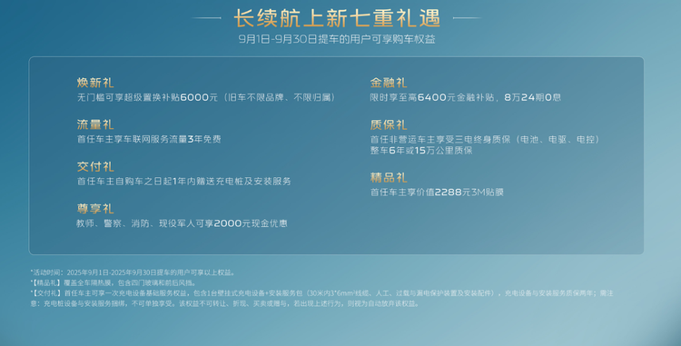 即日起至9月30日,购车用户可享:6000元置换补贴;最高6400元金融贴息;3年免费车联网流量;三电系统终身质保(整车质保6年或15万公里);免费充电桩安装及价值2288元的3M品牌贴膜。教师、警察、消防员等职业人员额外享受2000元专属补贴。