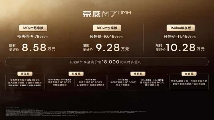 2025年9月17日,长续航中大型豪华轿车—— 荣威M7 DMH(参数|询价)正式上市。新车共推出160km舒享版、160km悦享版、160km臻享版3款车型,官方指导价9.78万元-11.48万元;即日起至10月31日(含)前完成大定并锁单的用户,可享限时美好价8.58万元-10.28万元,现在下定更可尊享至高价值18,000元限时四重礼,包含“五大件终身质保”、“零自燃终身保障”等多重专属购车权益。