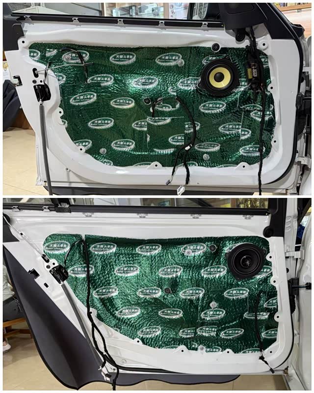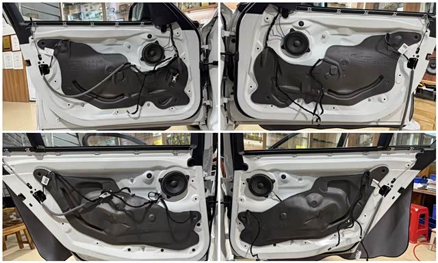 门板进行彻底清洁后,隔音处理采用了双层隔音工艺,内层贴附抑制钣金共振,外层密封形成箱体。这不仅大幅降低了风噪和路噪,更让每个车门都变成了一个扎实的“音箱”,极大提升了中低频的响应和纯度,为喇叭提供一个理想的工作环境。