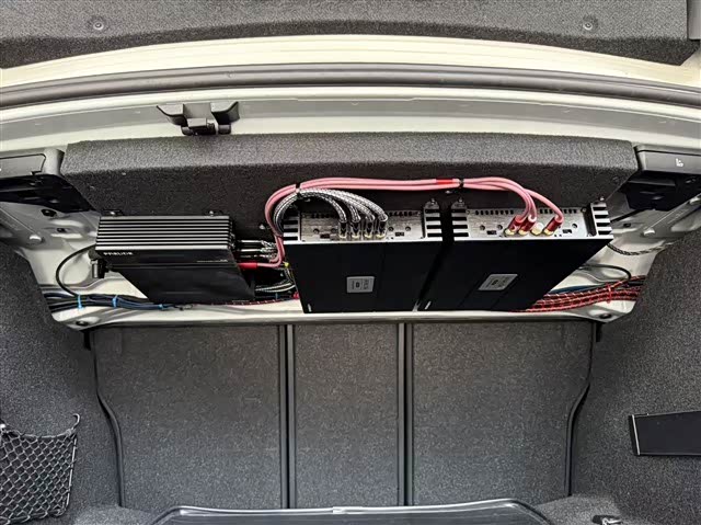 两台FRED FS-4功放和FP-8A处理器经过精心设计,整齐地固定安置在后备箱车顶部,极其节省空间且便于调试,保持了车辆的实用性与美观。