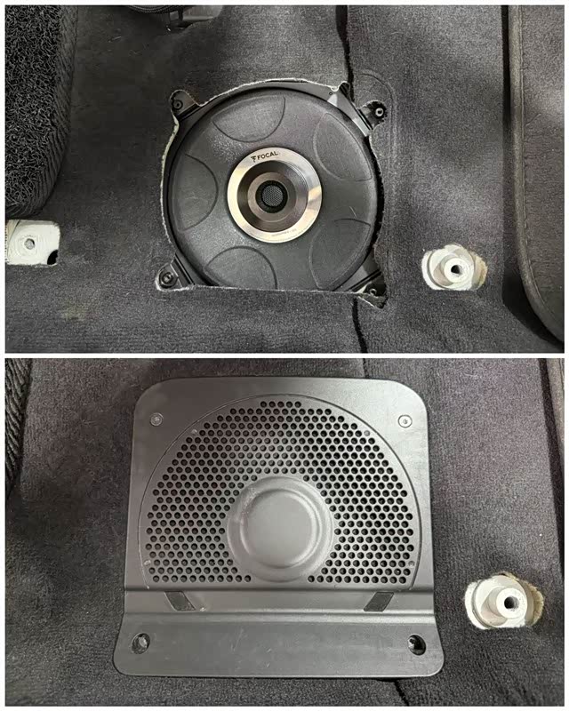 喇叭均采用原装位安装,真正做到无损改装。劲浪ISUB BMW 4中低音单元精准安装在脚踏板旁,并加装专用保护罩,避免脚部磕碰。