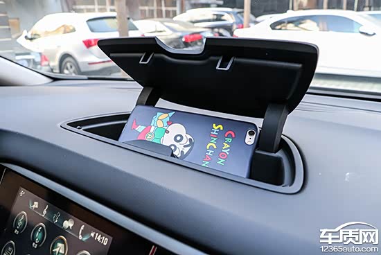 储物槽左侧配有一个小型储物槽,可将手机放置于此。另外,在前端设置了一个手动开启的隐藏储物格按钮,按下后,其深度有所增加,同时也可放置钱包等隐私物品。