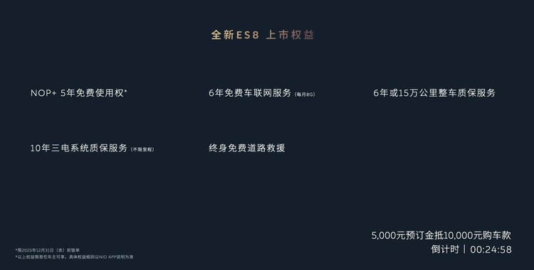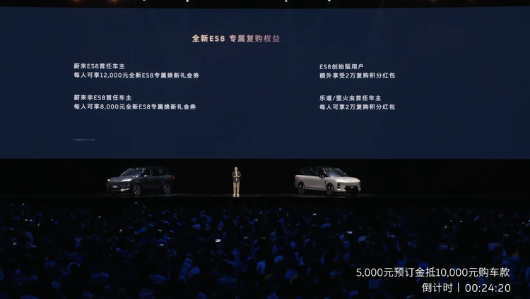 而且,全新 ES8 标配即顶配,配置拉满。空悬、激光雷达、三把零重力座椅、900V高压平台、4秒级零百加速,现在30万内全部搞定!首任车主还能享受 5 年免费全域领航辅助 NOP - 1,赠送价值 2980 元的飞航头等舱五件套。如果是老车主复购,首任 ES8 车主有 1.2 万专属换新礼金券,非 ES8 首任车主也能享受 8000 元的优惠,乐道萤火虫首任车主更能拿到 2 万复购积分红包。
