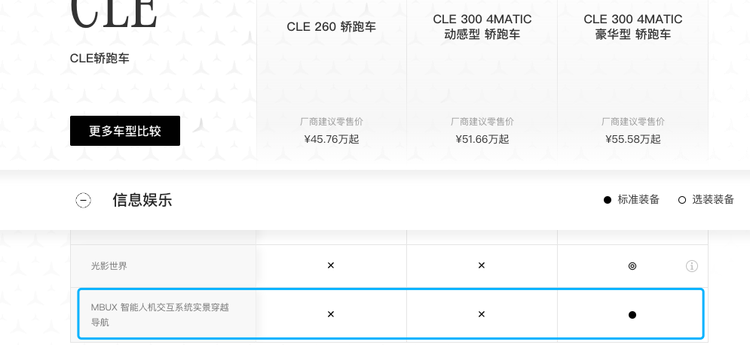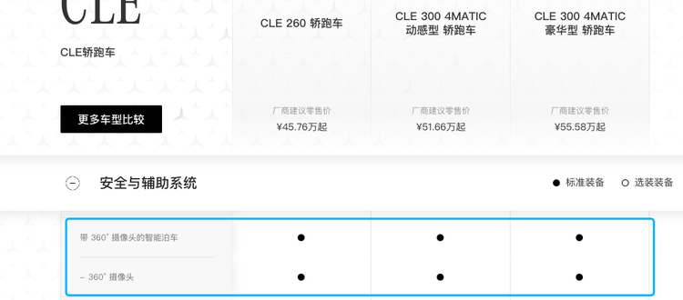 与2025款车型相比,2026款奔驰CLE轿跑车全系引入智能手机数字钥匙。在此基础上,CLE 260轿跑车与CLE 300 4MATIC动感型轿跑车还增加了带360度摄像头的智能泊车(此前选装价格:0.56万元),CLE 300 4MATIC豪华型轿跑车升级标配MBUX智能人机交互系统实景穿越导航(此前选装价格:0.35万元)。