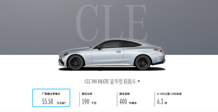 日前,笔者从梅赛德斯-奔驰官网获悉,2026款奔驰CLE轿跑车现已上市,其中CLE 260轿跑车与CLE 300 4MATIC动感型轿跑车的官方指导价分别为45.76万元、51.66万元,定价与2025款车型保持一致;CLE 300 4MATIC豪华型轿跑车的官方指导价由55.23万元变更为55.58万元,涨幅0.35万元。
