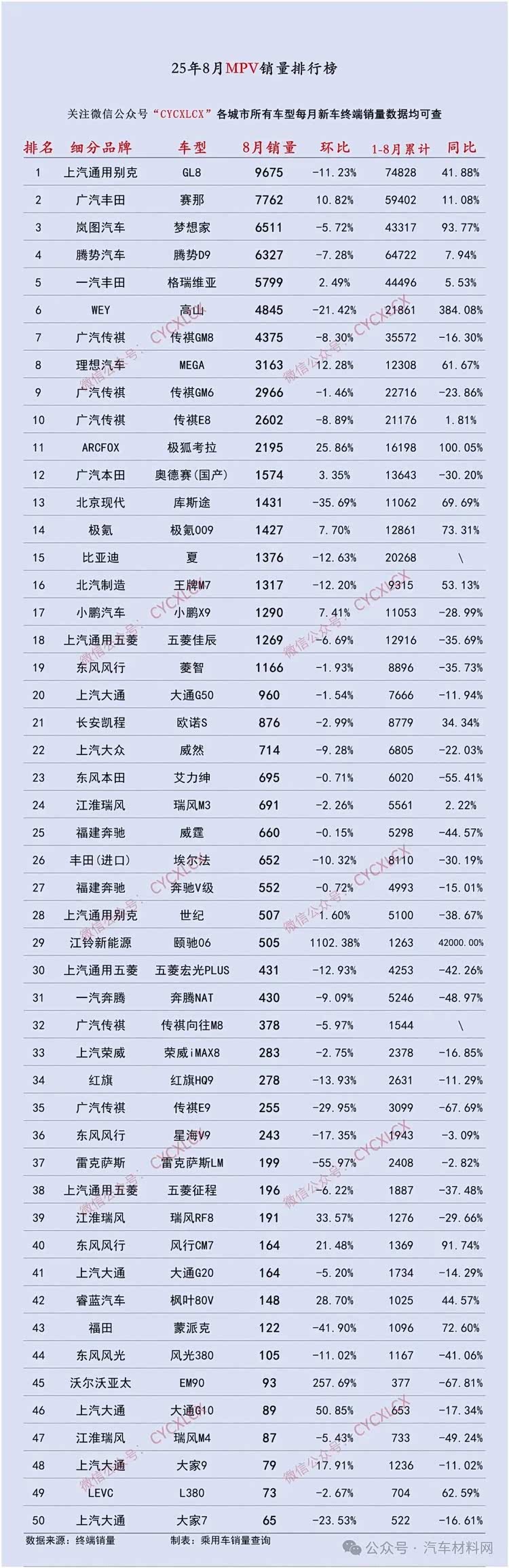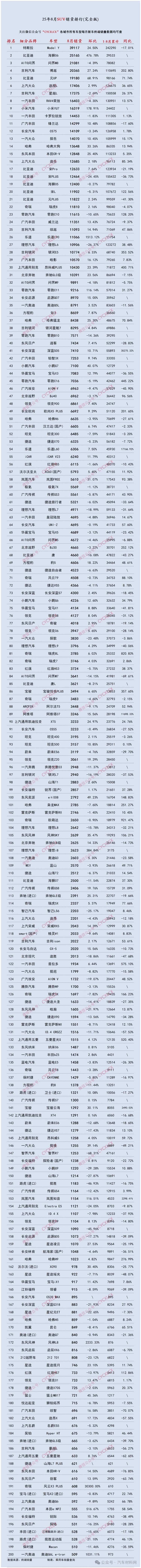 2025年8月国内轿车/SUV/MPV排行榜