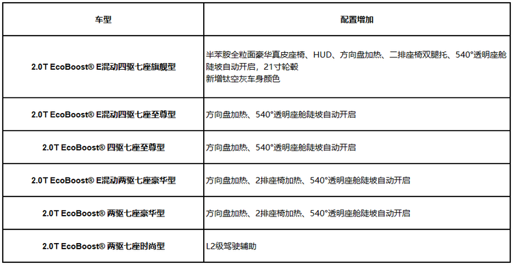 新款延续了福特锐界L特有的2-2-3座椅布局和二排头等舱级空间体验,让全家出游更舒适;大马力E混动系统兼顾了强动力、低油耗和长续航优势,蝉联2023~2024年“中国心”十佳发动机及混动系统奖项;加上全车超50%高强度钢和同级独有的540°透明座舱,成为真正的“全家安心出游神器”。