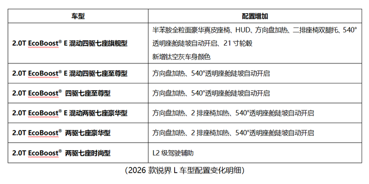 9月26日,2026款福特锐界L升级上市,正式推出7款车型,官方指导价22.98万元-30.98万