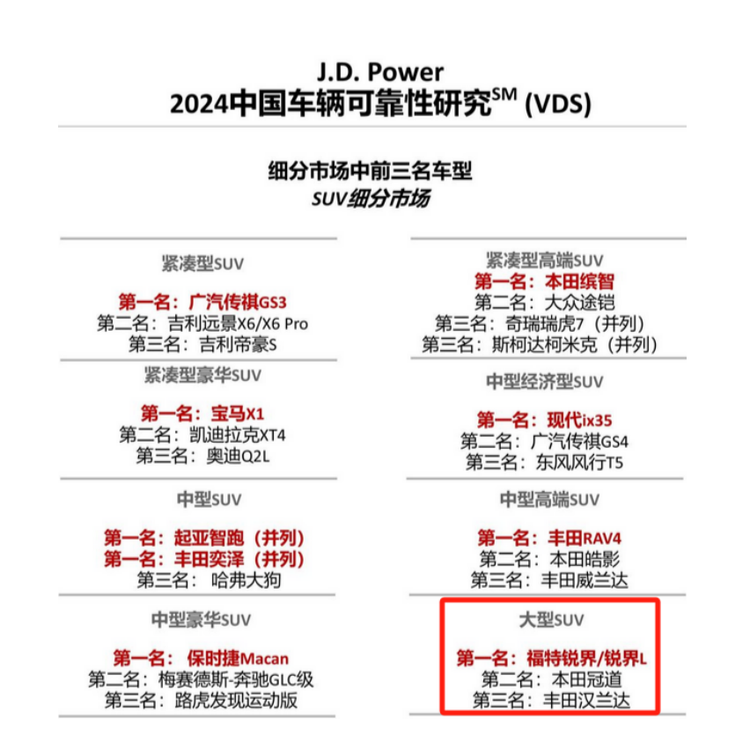 在2025年公布的J.D. Power 2024中国车辆可靠性研究SM(VDS)中,福特锐界L获得大型SUV可靠性第一名。在车辆实际出行体验上,第一批福特锐界L混动版车主有的行驶里程已超10万公里,行车足迹遍布中国大陆所有省份的各种地形地貌,经过10万公里的考验,福特锐界L各项功能正常稳定工作,实测总行程平均百公里油耗7.66L、每公里油费不到5毛9。刹车片、火花塞等磨损微小,平均每万公里保养费用不到360元,展现出福特锐界L的扎实制造水准和耐久性品质。