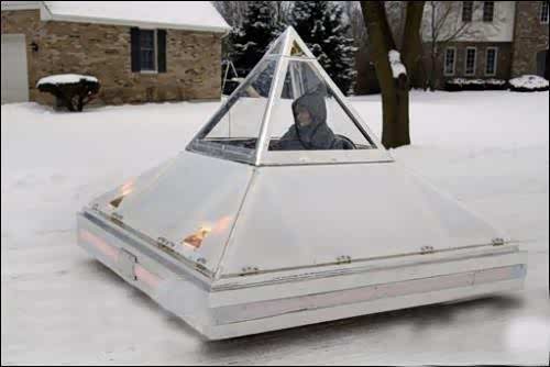 什么东西重达8000磅,却能在极小的地方转弯,看起来还像埃及金字塔?这就是创意十足的金字塔型电动车——梦幻车123(Dream Car123)。发明者Greg Zanis在他两个儿子的帮助下,制造了这辆通过太阳能提供动力的四轮电动车。 梦幻车123的外形看起来与金字塔相像,但它其实装备得像装甲车,晚上还用氖光灯照明。梦幻车123的车体重量有8000磅,内置的80块蓄电池可以驱动车内的4台电动机。Zanis介绍,这辆金字塔型的汽车,最出色的地方就是它使用电为动力,每次充电可以行驶80英里,最高时速可到45mph,将蓄电池充满只需2个小时。据说制作这辆车共花费了Zanis一家60000美元,Zanis还另外设计了一个塔式车库,收集光能和风能为车子重复充电。
