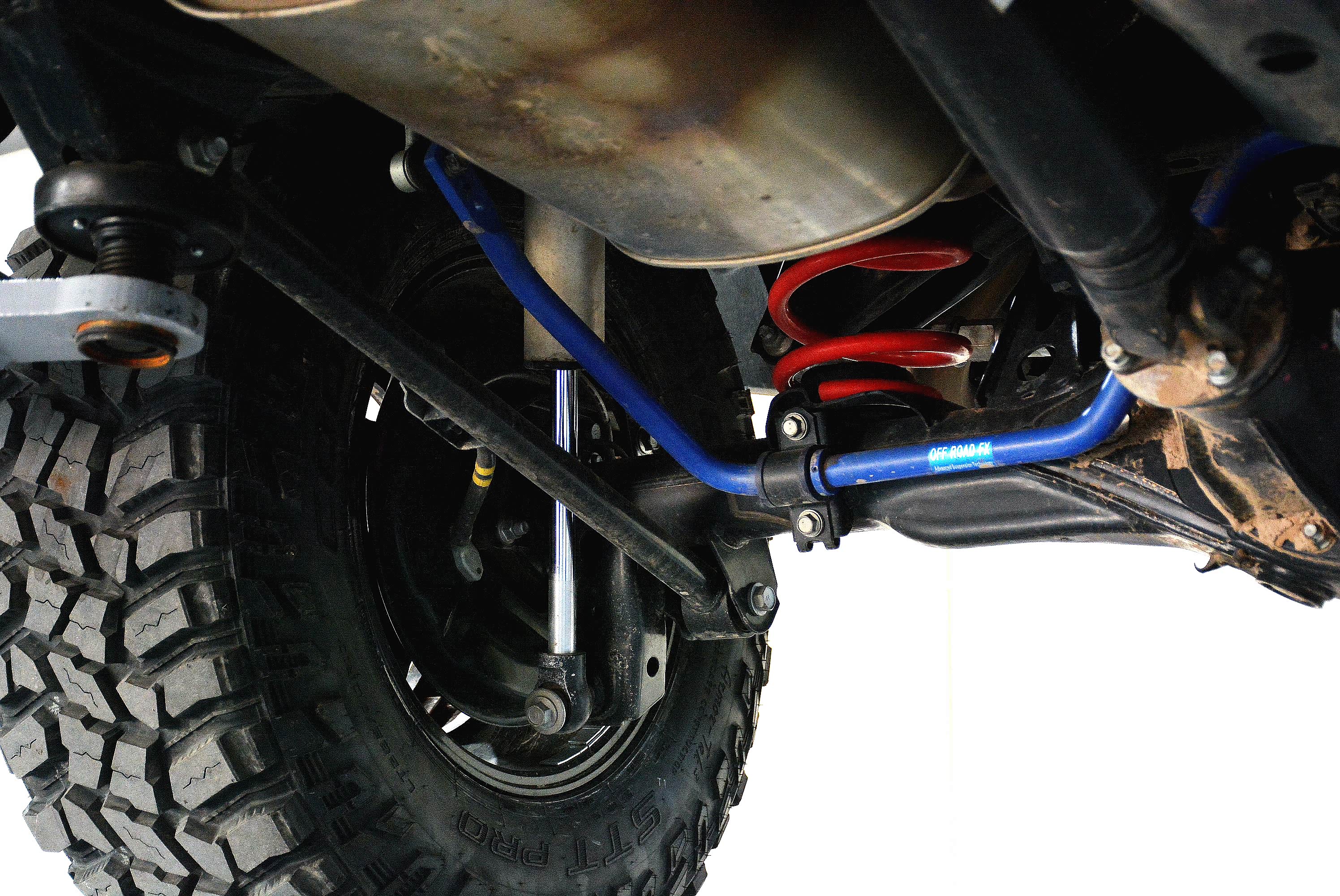 蓝色的是加强稳定杆,用于为升高后的车辆提供强有力的稳定保护。越野过程中也可以保持车身姿态,不过会稍微损失一些舒适性。为了安全,值了!那个黑色的,类似于减震器的小东西是转向减震器,左右车轮一边一个,在颠簸路面能够降低因路面不平造成的方向盘打手,也是提升安全的配置。